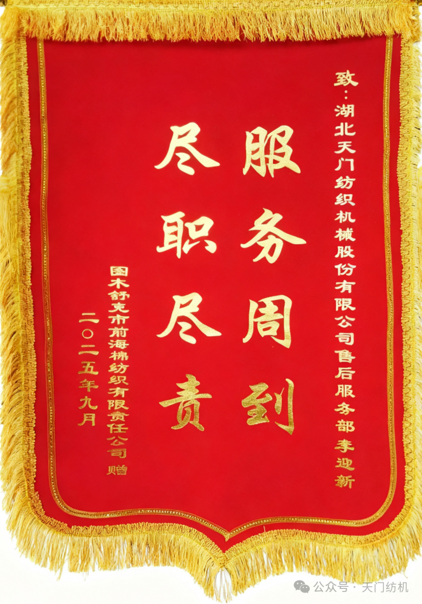 “服務周到,盡職盡責”,這是天門紡機新疆客戶圖木舒克市前海棉紡織有限責任公司送給90后售后服務工程師李迎新的錦旗贈言。短短八個字,既是肯定,又是褒揚。
